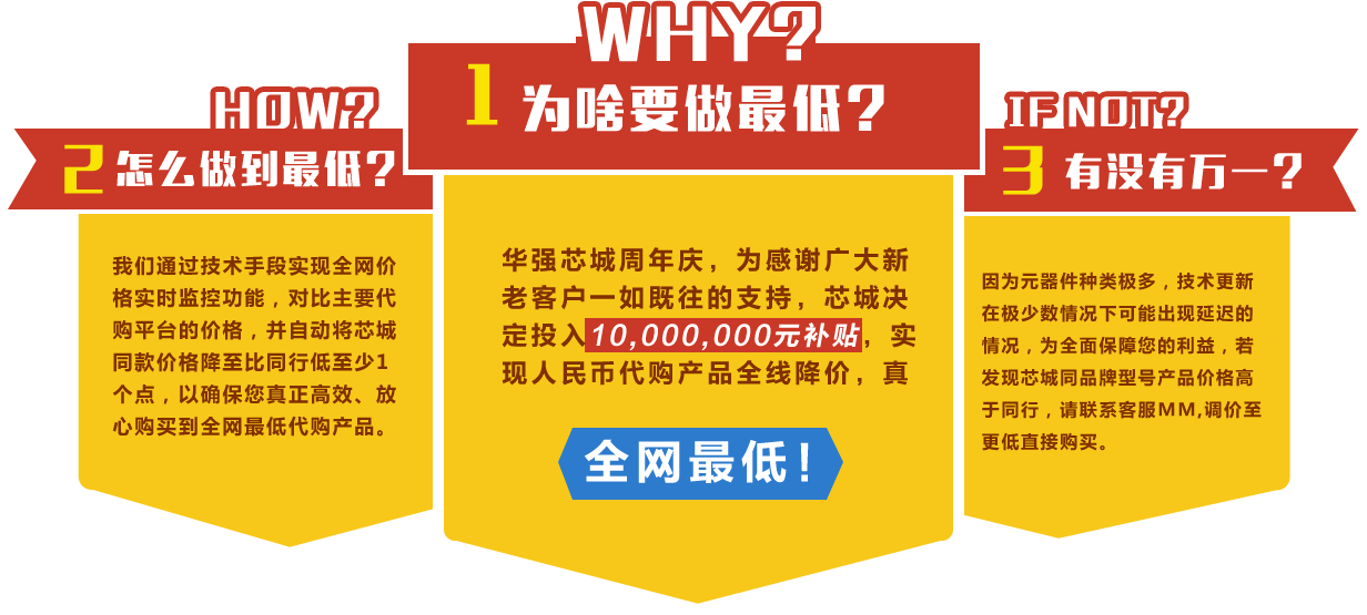 華秋商城周年慶,為感謝廣大新老客戶一如既往的支持,芯城決定投入10,000,000元補(bǔ)貼,實(shí)現(xiàn)人民幣代購產(chǎn)品全線降價(jià),真正做到全網(wǎng)最低!我們通過技術(shù)手段實(shí)現(xiàn)全網(wǎng)價(jià)格實(shí)時(shí)監(jiān)控功能,對比主要代購平臺(tái)的價(jià)格,并自動(dòng)將芯城同款價(jià)格降至比同行低至少1個(gè)點(diǎn),以確定您真正高效、放心購買到全網(wǎng)最低代購產(chǎn)品。因?yàn)樵骷N類極多,技術(shù)更新在極少數(shù)情況下可能出現(xiàn)延遲的情況,為全面保障您的利益,若發(fā)現(xiàn)芯城同品牌型號(hào)產(chǎn)品價(jià)格高于同行,請聯(lián)系客服MM,調(diào)價(jià)至更低直接購買。 不怕比!怕不比!華秋商城全線代購產(chǎn)品直降5個(gè)點(diǎn)