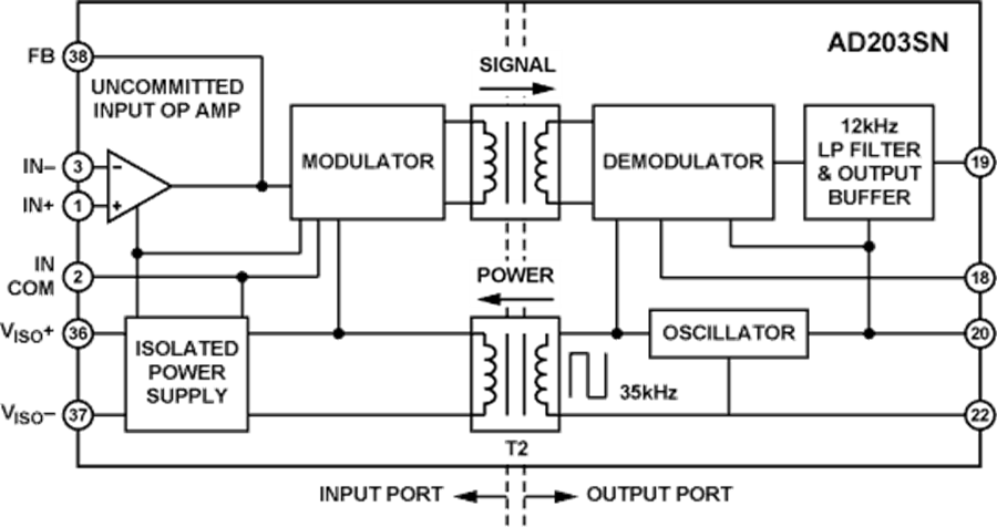 AD203SN利用內(nèi)部變壓器耦合,可在隔離放大器(包括電源)的輸入級與輸出級之間提供整體電氣隔離。AD203SN功能設(shè)計(jì)全面,采用+ 15 V直流單電源供電,無需外部DC/DC轉(zhuǎn)換器。因此,設(shè)計(jì)人員可以將必要的電路開銷降至最低,從而降低整體設(shè)計(jì)與元件成本。此外,變壓器耦合器件的功耗、非線性度和漂移特性明顯優(yōu)于通過其他隔離技術(shù)實(shí)現(xiàn)的特性,而不影響帶寬或噪聲性能。最后,AD203SN即使在持續(xù)共模應(yīng)力下也能保持高性能。