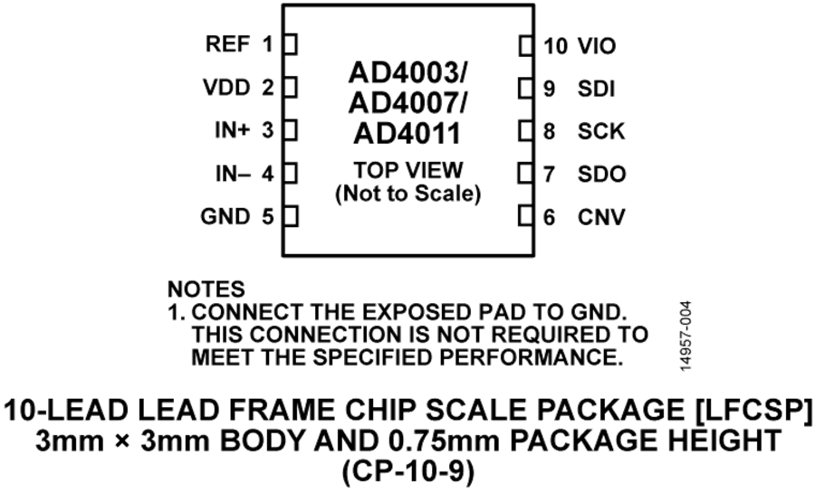 AD4011 采用 10 引腳 MSOP 或 10 引腳 LFCSP 封裝,可在 ?40°C 至 +125°C 的溫度范圍內工作。此器件的引腳與 18 位 2 MSPS AD4003 兼容。