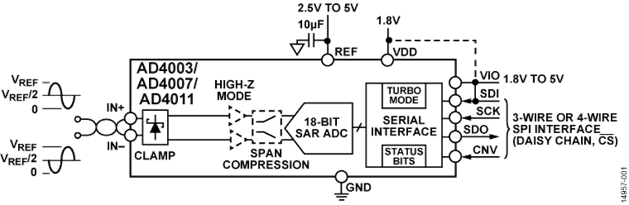 與 SPI 兼容的通用串行接口配有七種不同的模式,包括能夠使用 SDI 輸入在單根 3 線式總線上以菊花鏈形式連接多個 ADC,并且提供可選的繁忙指示器。AD4011 使用單獨的 VIO 電源,與 1.8 V、2.5 V、3 V 和 5 V 邏輯兼容。