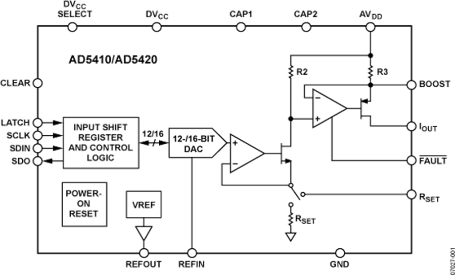 AD5410/AD5420是可編程電流源輸出的低成本、精密、完全集成的12/16位轉換器,可滿足工業(yè)過程控制應用的要求。輸出電流范圍可編程為4mA至20 mA、0mA至20mA或者0mA至24mA的超量程。輸出具有開路保護功能,可以驅動1H的電感負載。這款器件采用10.8 V至40V(AD5410/AD5420AREZ)或10.8V至60V(AD5410/AD5420ACPZ)電源供電。輸出回路為0 V至AVDD – 2.5 V。靈活的串口為SPI和MICROWIRE兼容接口,可在三線制模式下工作,以將隔離應用所需的數字隔離電路降至最少。這款器件還包含確保器件在已知狀態(tài)下上電的上電復位功能,以及將輸出設定為所選電流范圍低端的異步清零(CLEAR)引腳。