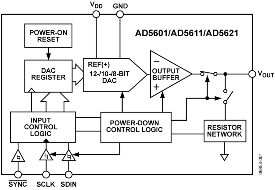 三款器件的基準(zhǔn)電壓均從電源輸入獲得,因此具有最寬的動(dòng)態(tài)輸出范圍。上述器件均內(nèi)置一個(gè)上電復(fù)位電路,確保DAC輸出上電至0 V并保持該電平,直到對(duì)該器件執(zhí)行一次有效的寫(xiě)操作為止。