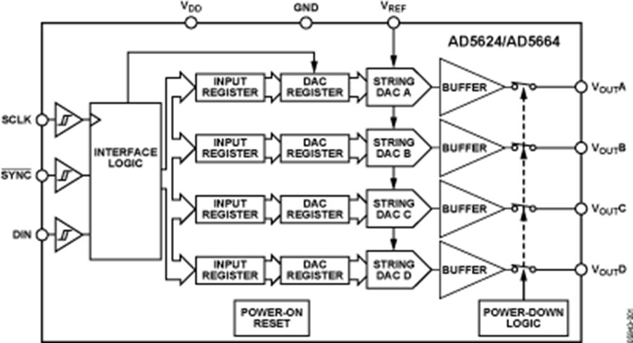 AD5624/AD5664內(nèi)置片內(nèi)精密輸出放大器,能夠?qū)崿F(xiàn)軌到軌輸出擺幅。