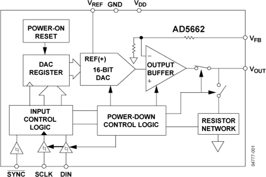 AD5662采用多功能三線式串行接口,能夠以最高30 MHz的時鐘速率工作,并與標(biāo)準(zhǔn)SPI?、QSPI?、MICROWIRE?、DSP接口標(biāo)準(zhǔn)兼容。它內(nèi)置片內(nèi)精密輸出放大器,能夠?qū)崿F(xiàn)軌到軌輸出擺幅。