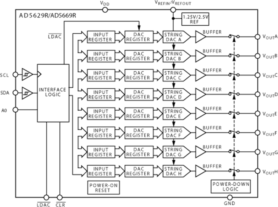 低功耗、小尺寸、引腳兼容的八通道DAC:AD5669R: 16 位AD5629R: 12 位