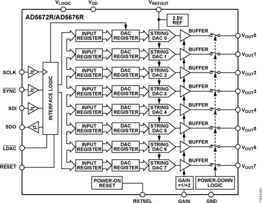 AD5672R/AD5676R采用多功能串行外設(shè)接口(SPI),時鐘速率最高達50 MHz,并均包含一個為1.8 V/3 V/5 V邏輯電平準備的VLOGIC引腳。