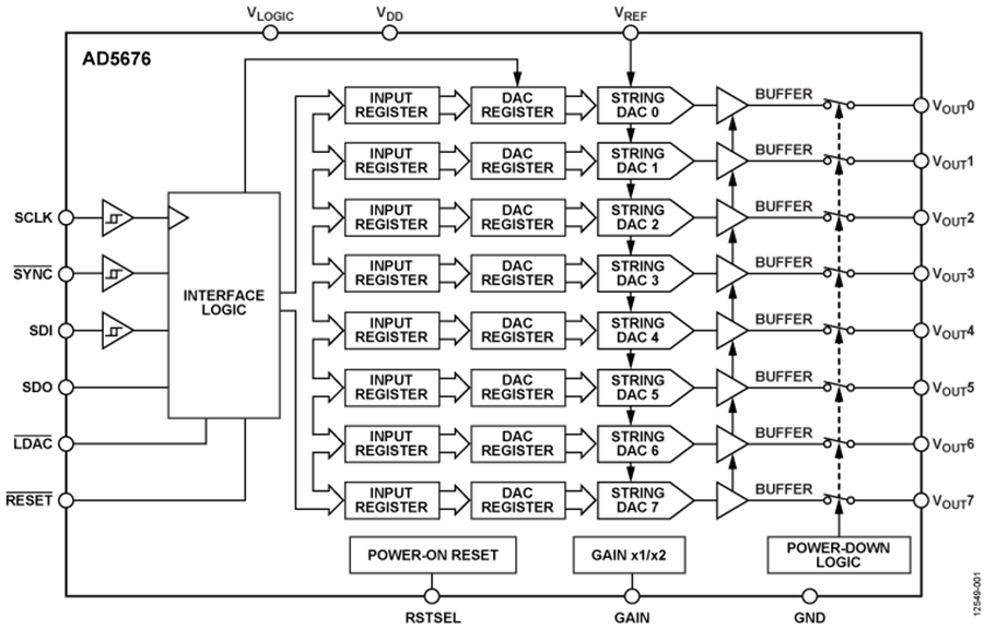 AD5676還內(nèi)置一個(gè)上電復(fù)位電路和一個(gè)RSTSEL引腳,確保DAC輸出上電至零電平或中間電平,直到執(zhí)行一次有效的寫操作為止。 每個(gè)器件都具有各通道獨(dú)立掉電特性,在掉電模式下,器件功耗降至2.5 μA。
