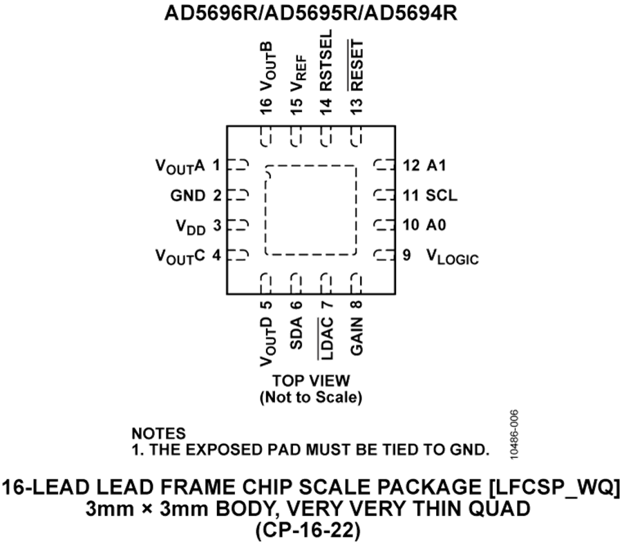AD5696R采用I2C接口,時(shí)鐘速率最高達(dá)400 kHz,包含一個為1.8V/3V/5V邏輯電平準(zhǔn)備的VLOGIC引腳。