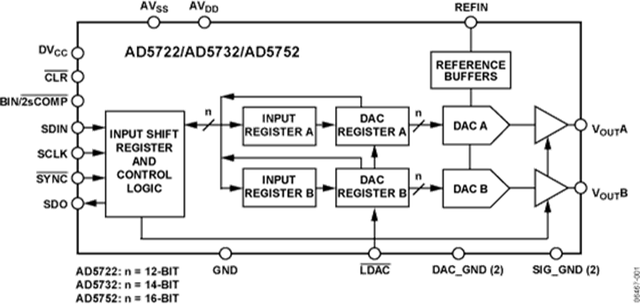 AD5722/AD5732/AD5752與AD5724/AD5734/AD5754引腳兼容,后者是完整的四通道、12/14/16位、串行輸入、單極性/雙極性電壓輸出DAC。