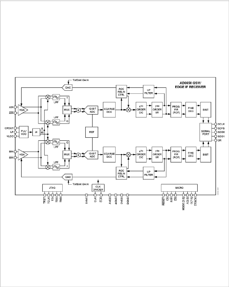 AD6650是一款分集中頻至基帶接收機(jī),適用于GSM/EDGE。這款窄帶接收機(jī)由一個(gè)集成DVGA、中頻至基帶I/Q解調(diào)器、低通濾波和一個(gè)雙通道寬帶ADC組成。該芯片可處理70 MHz至260 MHz的中頻輸入。接收機(jī)架構(gòu)經(jīng)過特別設(shè)計(jì),整個(gè)接收信號(hào)路徑只需要一個(gè)用于主信號(hào)的外部表面聲波(SAW)濾波器和一個(gè)用于分集信號(hào)的濾波器,便可達(dá)到GSM/EDGE阻塞要求。