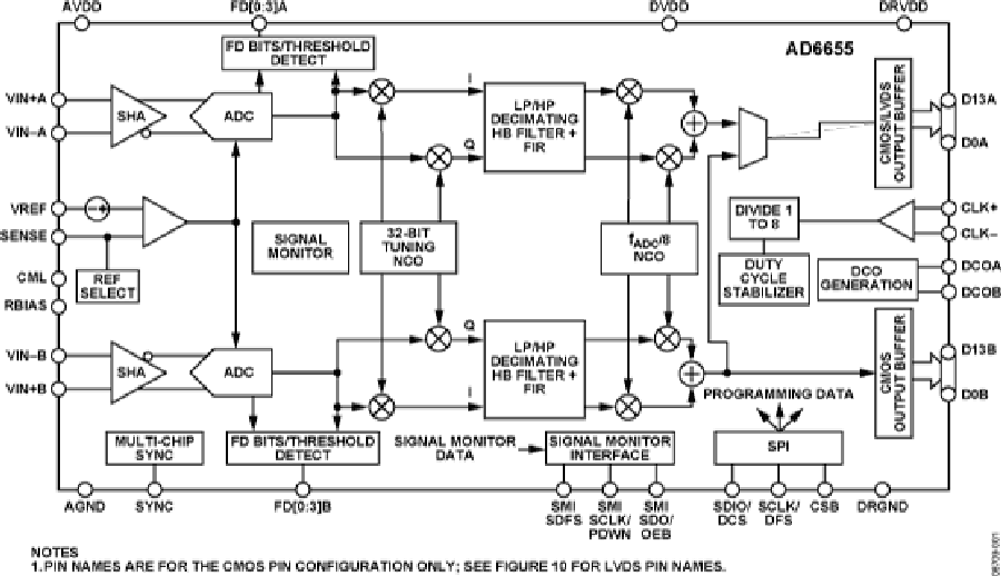 經(jīng)過(guò)數(shù)字處理之后,數(shù)據(jù)可以直接送至兩個(gè)外部14位輸出端口, 這些輸出可以設(shè)置為1.8 V至3.3 V CMOS或1.8 V LVDS。 另外,CMOS數(shù)據(jù)還可以僅利用端口A,通過(guò)交錯(cuò)配置,以雙倍數(shù)據(jù)速率輸出。