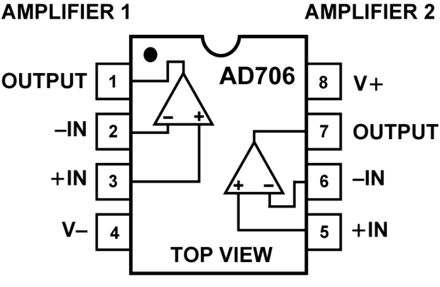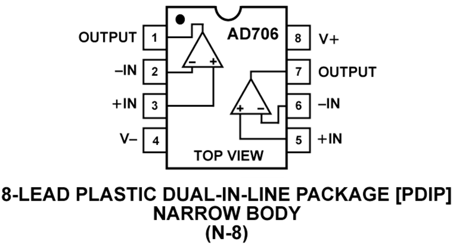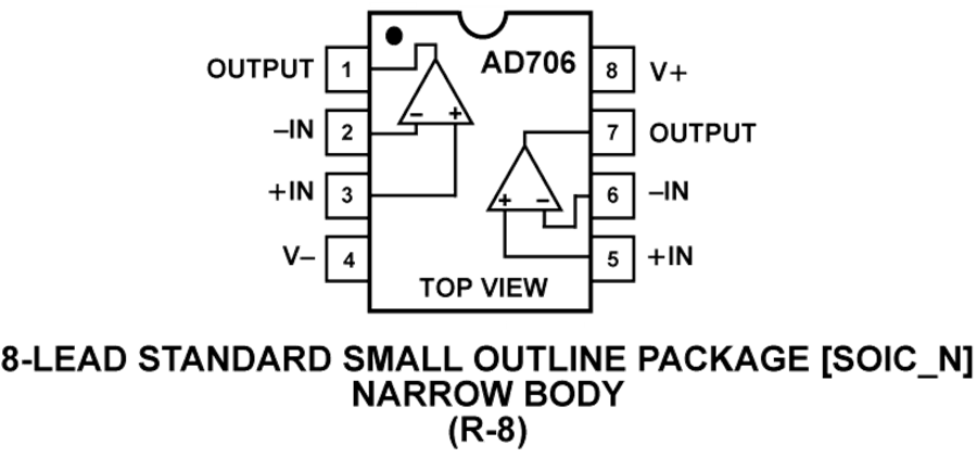 AD706提供兩種形式的8引腳封裝:小型塑封DIP和表貼(SOIC)封裝。