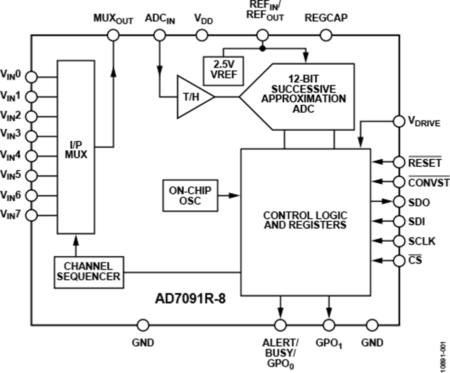 AD7091R-2/AD7091R-4/AD7091R-8系列具有多達(dá)8個(gè)帶通道序列器的單端模擬輸入,可以通過預(yù)先編程選擇通道轉(zhuǎn)換順序。