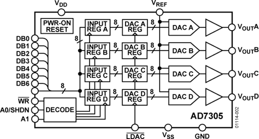 AD7304/AD7305均為四通道、8位DAC,采用+3 V至+5 V或±5 V單電源供電。AD7304具有一個串行接口,AD7305則具有一個并行接口。內部精密緩沖具有軌到軌擺幅。基準電壓輸入范圍同時包括兩個供電軌,能夠提供正或負滿量程輸出電壓。保證工作電壓范圍為+2.7 V、+5.5 V至±5 V,采用+3 V電源時功耗小于9 mW。滿量程電壓輸出由所施加的外部基準輸入電壓決定。軌到軌VREF輸入至DAC VOUT允許將滿量程電壓設置為正電源電壓VDD、負電源電壓VSS或二者之間的任何值。