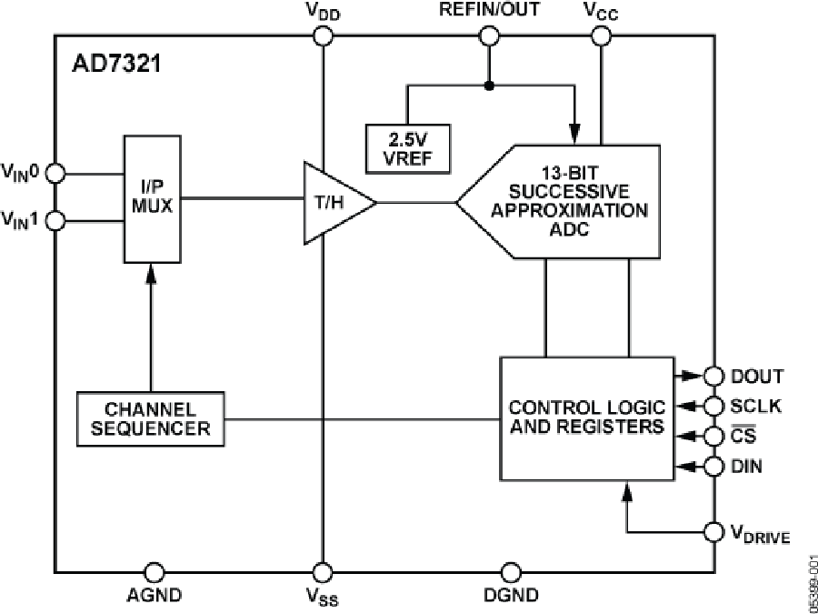 AD7321內(nèi)置一個(gè)2.5 V的參考電壓,同時(shí)也可采用外部參考。如果在REFIN/OUT針腳上施加3V參考電壓,AD7321則可接受±12V真雙極性模擬輸入。對(duì)于±12V輸入范圍,需采用最低±12V的VDD和VSS電源。