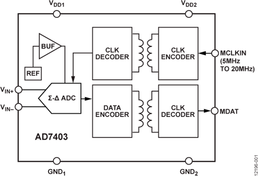 AD7403是一款高性能的二階Σ-Δ型調(diào)制器,片上的數(shù)字隔離采用ADI公司的iCoupler?技術(shù),能將模擬輸入信號轉(zhuǎn)換為高速單比特?cái)?shù)據(jù)流。 AD7403采用5 V(VDD1) 電源供電,可輸入±250 mV的差分信號(滿量程±320 mV)。 該差分輸入信號非常適合用于在要求電流隔離的高電壓應(yīng)用中監(jiān)控分流電壓。
