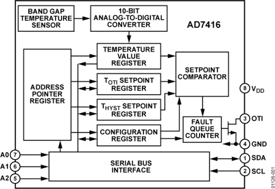 可選串行總線地址,一條總線最多可以連接8個(gè)AD7416/AD7417器件