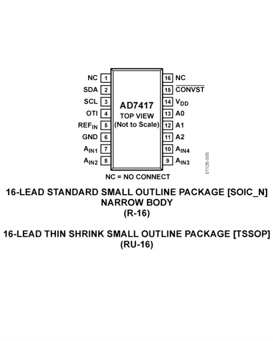 AD7417采用窄體、0.15英寸、16引腳小型封裝(SOIC)或16引腳超薄緊縮小型封裝(TSSOP)。AD7416和AD7418采用8引腳SOIC或MSOP封裝。