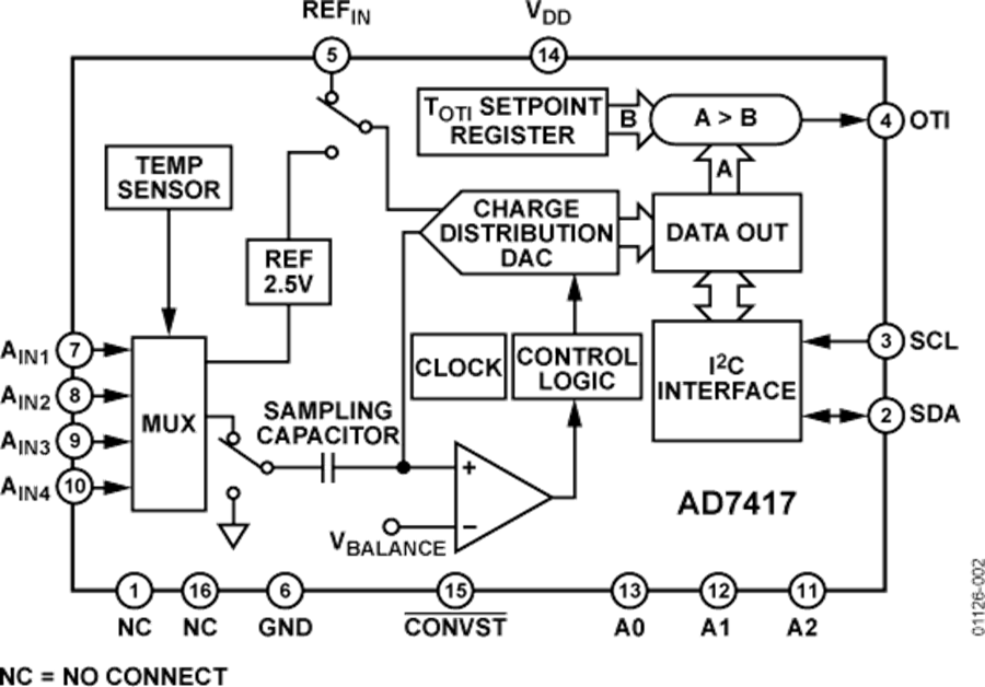 AD7416/AD7417/AD7418具有片內溫度傳感器,可以精確測量環(huán)境溫度(25°C時精度為±1°C,±2°C過溫)。測量溫度范圍為?40°C至+125°C。通過將通道0(溫度傳感器)的ADC碼與片內TOTI設定點寄存器的內容進行比較,實現(xiàn)過溫指示功能。
