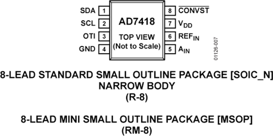 AD7417采用窄體、0.15英寸、16引腳小型封裝(SOIC)或16引腳超薄緊縮小型封裝(TSSOP)。AD7416和AD7418采用8引腳SOIC或MSOP封裝。