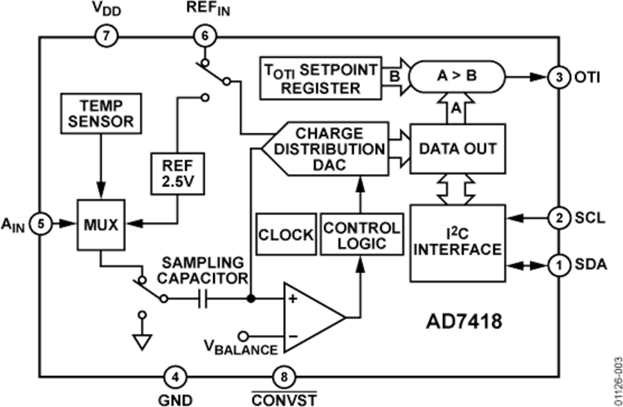 AD7416/AD7417/AD7418具有片內(nèi)溫度傳感器,可以精確測量環(huán)境溫度(25°C時精度為±1°C,±2°C過溫)。測量溫度范圍為?40°C至+125°C。通過將通道0(溫度傳感器)的ADC碼與片內(nèi)TOTI設(shè)定點寄存器的內(nèi)容進行比較,實現(xiàn)過溫指示功能。