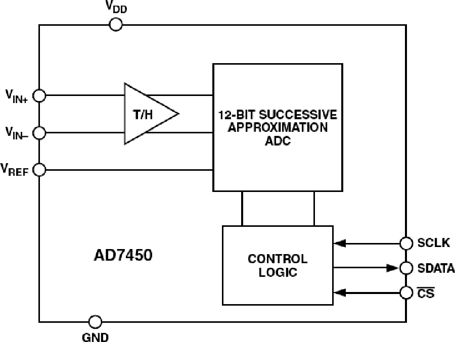 AD7450是一款12位、高速、低功耗、逐次逼近型(SAR)模數(shù)轉(zhuǎn)換器(ADC),采用全差分模擬輸入,工作電壓為3 V或5 V單電源,最高吞吐量分別可達(dá)833 kSPS或1 MSPS。該器件內(nèi)置一個(gè)低噪聲、寬帶寬、差分采樣保持(T/H)放大器,可處理1 MHz以上的輸入頻率,-3 dB帶寬典型值為20 MHz。AD7450的外部基準(zhǔn)電壓通過VREF引腳輸入,可在100 mV至3.5 V范圍內(nèi)變化,具體取決于電源和應(yīng)用。基準(zhǔn)電壓值決定器件的共模電壓范圍。利用這一真差分輸入結(jié)構(gòu)和可變基準(zhǔn)電壓輸入,用戶可以選擇各種輸入范圍和偏置點(diǎn)。