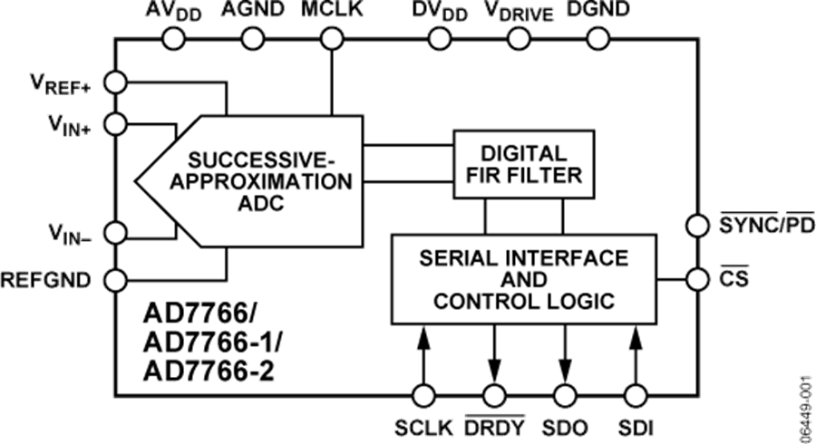 AD7766/AD7766-1/AD7766-2的內(nèi)置數(shù)字濾波器(完全線性相位響應(yīng))可以對過采樣輸入電壓信號進(jìn)行濾波并去除帶外噪聲。這種過采樣架構(gòu)還減少了對前端抗混疊濾波的需求。AD7766的其他特性包括SYNC/PD (同步/關(guān)斷)引腳,允許多個(gè)AD7766器件同步。另外,通過SDI引腳還能夠?qū)崿F(xiàn)多個(gè)AD7766器件的菊花鏈互連結(jié)構(gòu)。
