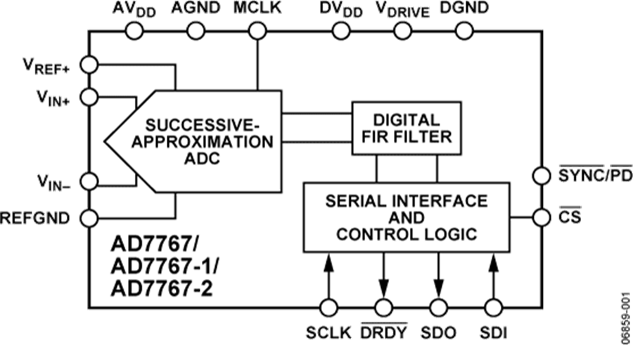 AD7767/AD7767-1/AD7767-2 片上集成數(shù)字濾波器(包括線性相位響應(yīng)),通過(guò)過(guò)采樣輸入來(lái)消除帶外噪聲。這種過(guò)采樣架構(gòu)還減少了對(duì)前端抗混疊濾波的需求。AD7767還具有一個(gè) SYNC/PD (同步/掉電)引腳,可用于多個(gè)AD7767器件之間的同步。另外,通過(guò)SDI引腳還能夠?qū)崿F(xiàn)多個(gè)AD7767器件的菊花鏈互連結(jié)構(gòu)。