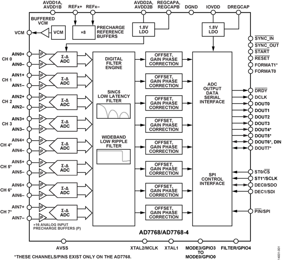 AD7768/AD7768-4分別為每通道集成Σ-Δ型調(diào)制器和數(shù)字濾波器的8通道和4通道、同步采樣Σ-Δ型模數(shù)轉(zhuǎn)換器(ADC),支持交流和直流信號的同步采樣。