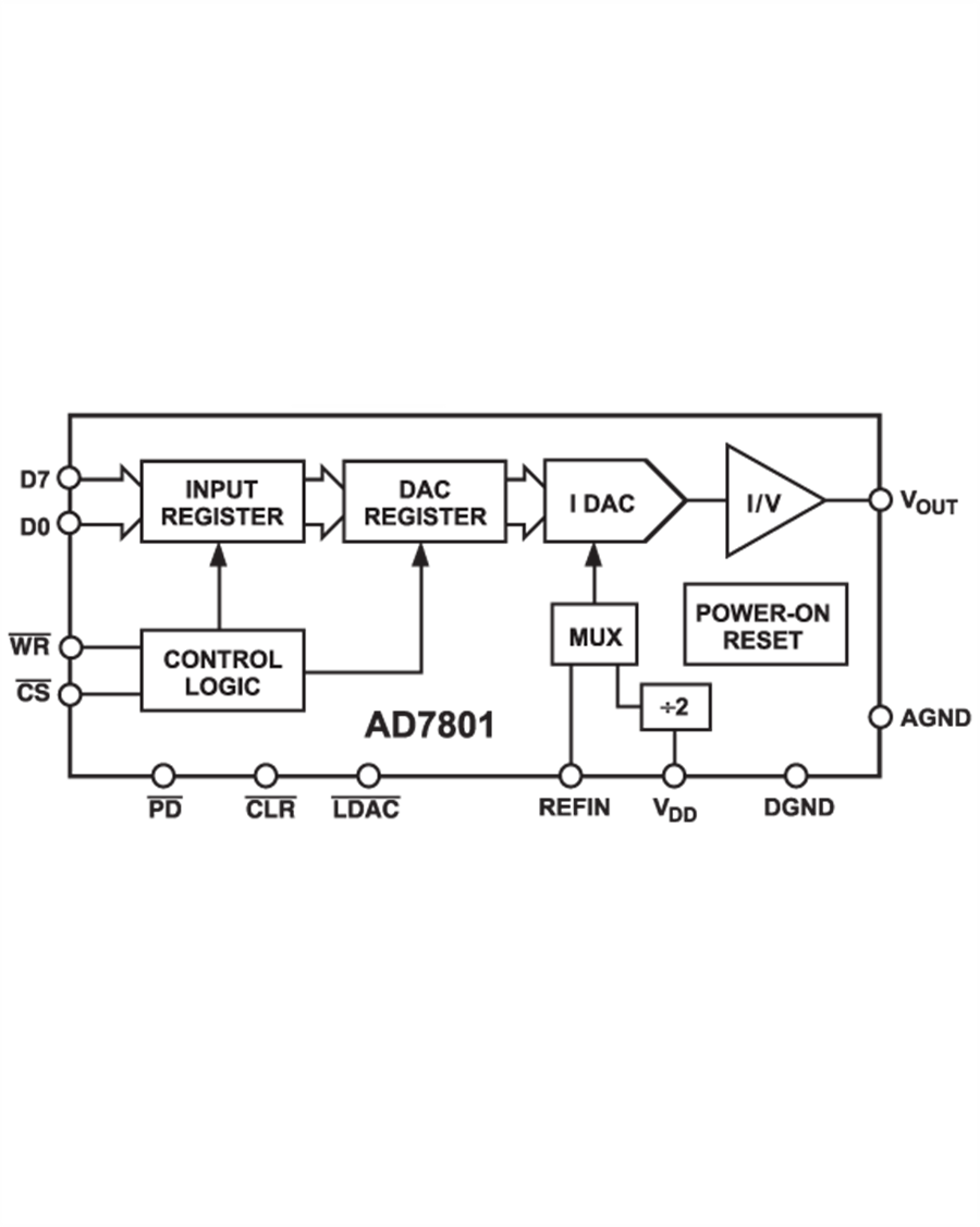 AD7801是一款單通道、8位電壓輸出DAC,采用+2.7 V至+5.5 V單電源供電。它內(nèi)置片內(nèi)精密輸出緩沖,能夠?qū)崿F(xiàn)軌到軌輸出擺幅。AD7801具有一個(gè)并行微處理器和DSP兼容接口,該接口配有高速寄存器和雙緩沖接口邏輯。數(shù)據(jù)在CS或WR的上升沿載入輸入寄存器。AD7801有兩種基準(zhǔn)電壓選擇:從VDD獲得內(nèi)部基準(zhǔn)電壓或通過REFIN引腳獲得外部基準(zhǔn)電壓。利用異步CLR 輸入可以將該DAC的輸出清零。