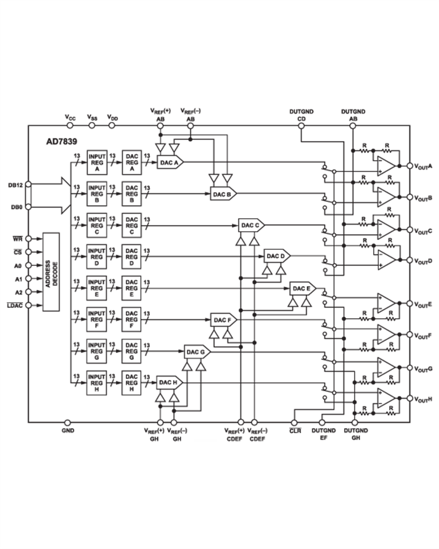 AD7839在單芯片上集成了8個13位電壓輸出DAC。它采用±5 V基準電壓,輸出電壓滿量程范圍為±10 V。共有3個獨立的差分基準電壓:一個用于DAC A和B,一個用于DAC G和H,一個用于DAC C、D、E和F。在/WR、/CS和DAC地址引腳A0–A2的控制下,AD7839將來自外部總線的13位并行數(shù)據(jù)載入其中一個輸入鎖存器。當DAC寄存器接收到新數(shù)據(jù)時,DAC輸出就會更新。各DAC輸出均利用增益為2的放大器進行緩沖,通過DUTGND引腳可以將一個外部DAC失調(diào)電壓插入放大器。AD7839采用44引腳PQFP封裝。