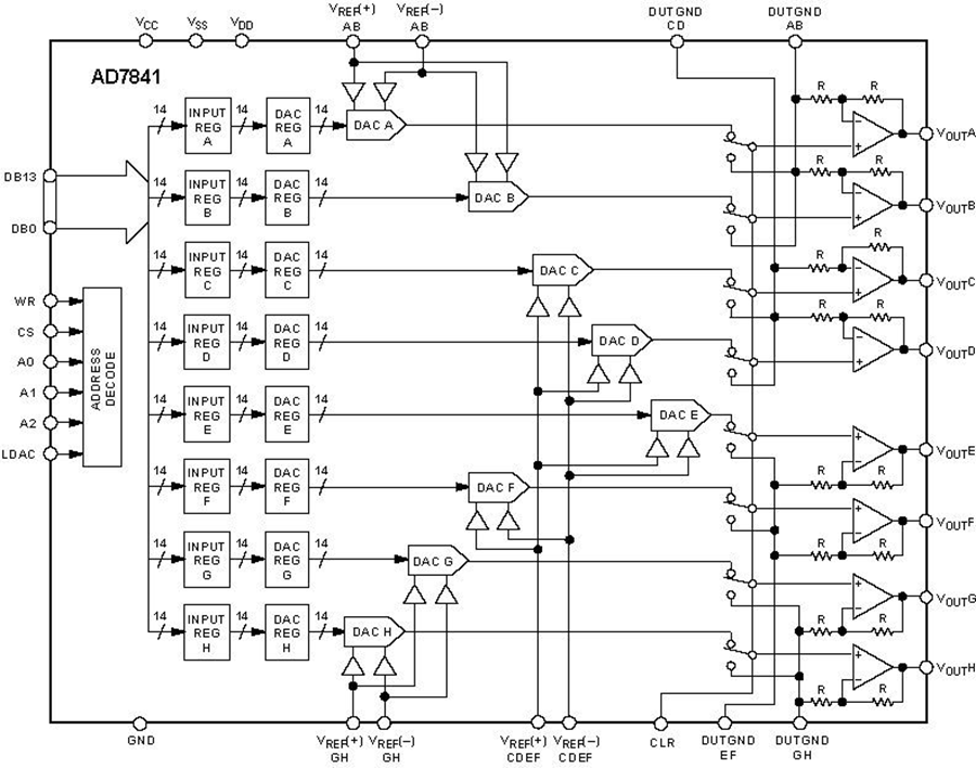 AD7841在單芯片上集成了8個14位緩沖電壓輸出DAC。它采用±5 V基準電壓,輸出電壓滿量程范圍為±10 V。共有3個配有緩沖輸入的獨立差分基準電壓:一個用于DAC A和B,一個用于DAC G和H,一個用于DAC C、D、E和F。在WR、CS和DAC地址引腳A0–A2的控制下,AD7841將來自外部總線的14位并行數據載入其中一個輸入鎖存器。當DAC寄存器接收到新數據時,DAC輸出就會更新。各DAC輸出均利用增益為2的放大器進行緩沖,通過DUTGND引腳可以將一個外部DAC失調電壓插入放大器。AD7841采用44引腳PQFP封裝。