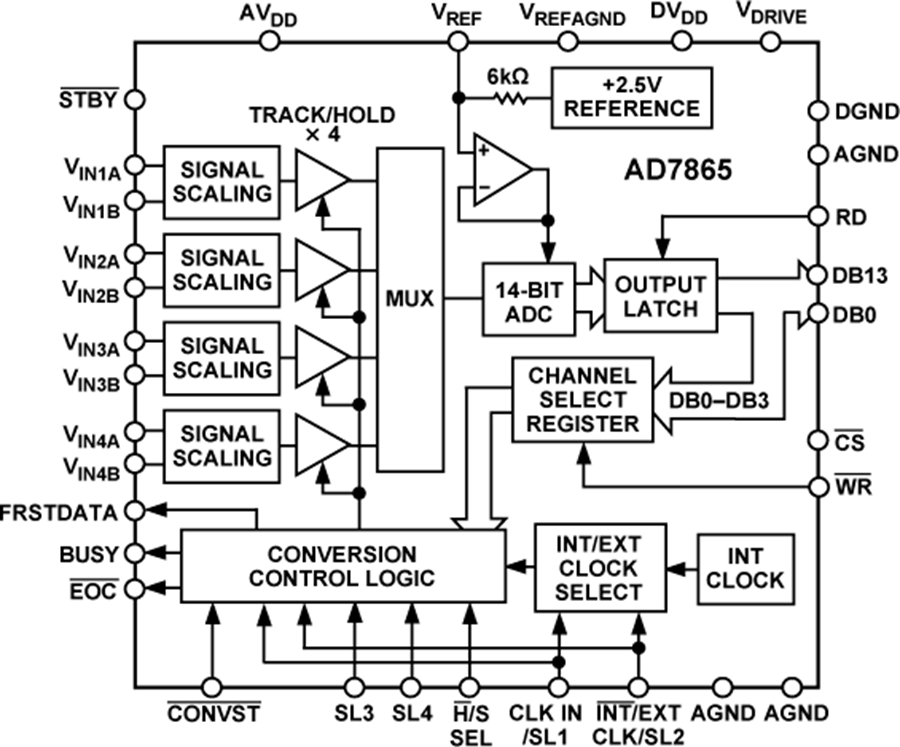 AD7865是一款快速、低功耗、4通道、14位同時(shí)采樣模數(shù)轉(zhuǎn)換器(ADC),采用+5 V單電源供電。該器件內(nèi)置一個(gè)2.5 微秒(μs)逐次逼近型ADC、四個(gè)采樣保持放大器、2.5 V基準(zhǔn)電壓源、片內(nèi)時(shí)鐘振蕩器、信號(hào)調(diào)理電路和一個(gè)高速并行接口。4個(gè)通道上的輸入信號(hào)同時(shí)進(jìn)行采樣,因而可保留4個(gè)模擬輸入上的信號(hào)相對(duì)相位信息。該器件可接受的模擬輸入范圍為±10 V、±5 V或±2.5 V。模擬輸入均具有過(guò)壓保護(hù),允許輸入電壓達(dá)到±20 V,而不會(huì)損壞器件或影響正在進(jìn)行的轉(zhuǎn)換。