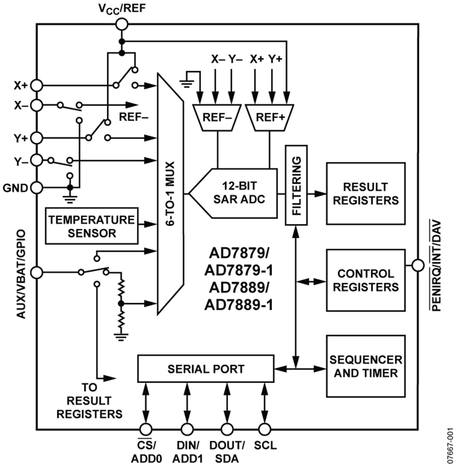 AD7879/AD7889擁有可編程引腳,可以用作到ADC的輔助輸入、電池監(jiān)控器或通用接口。此外,可編程中斷輸出可以在三種模式下運行:作為新數(shù)據(jù)可用時的通用中斷(DAVINT);或者作為屏幕被觸摸時的觸點中斷(PENIRQ)。AD7879/AD7889可提供溫度與觸摸壓力測量。