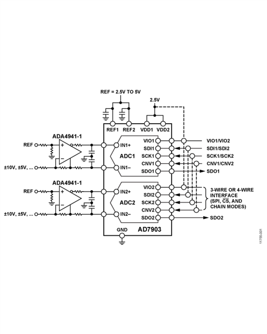 AD7903是一款雙通道16位、逐次逼近型模數(shù)轉(zhuǎn)換器(ADC),各ADC采用單電源(VDDx)供電。它內(nèi)置兩個低功耗、高速、16位采樣ADC和一個多功能串行接口端口。在CNVx上升沿,AD7903對INx+與INx-引腳之間的電壓差進行采樣,這兩個引腳上的電壓擺幅通常在0 V至 VREF之間、相位相反。REFx引腳的基準電壓(VREF)由外部提供,可獨立于電源電壓引腳(VDDx)來設(shè)定。該器件的功耗與吞吐速率呈線性變化關(guān)系。