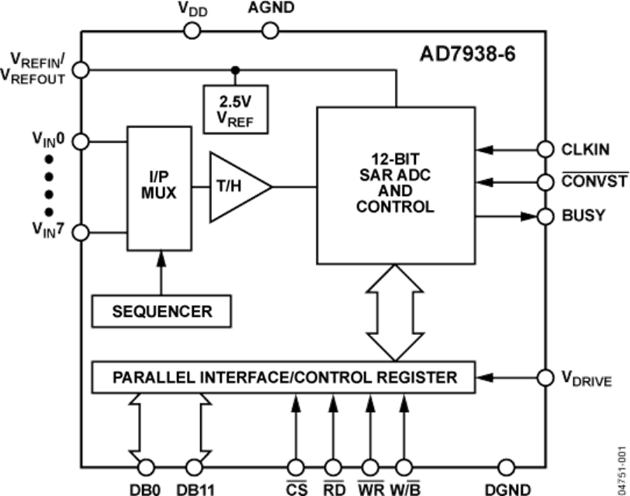 AD7938-6具有8個(gè)帶通道序列器的模擬輸入通道,可以通過(guò)預(yù)先編程選擇通道轉(zhuǎn)換順序。該器件可采用單端、全差分或偽差分模擬輸入。