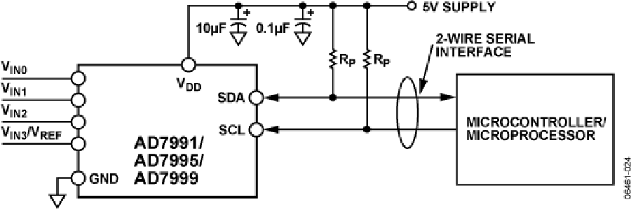 當四個通道都用作模擬輸入時,基準電壓從VDD獲得,由此可以實現(xiàn)最寬的動態(tài)輸入范圍。因此,ADC的模擬輸入范圍是0 V至VDD。也可以使用外部基準電壓,通過VIN3 /VREF引腳接入。