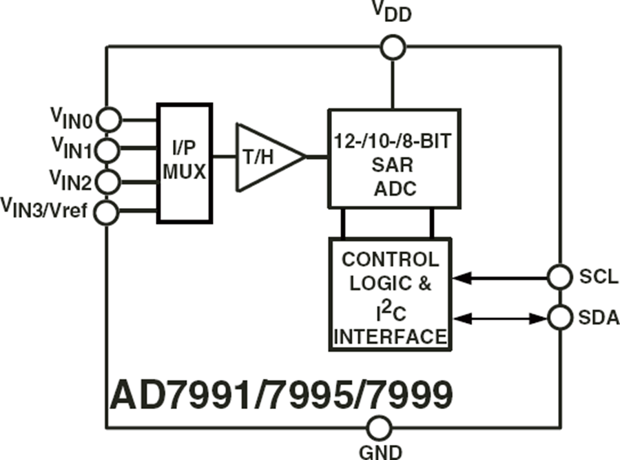 AD7991/AD7995/AD7999是內(nèi)置I2C?兼容型接口的12/10/8位、低功耗、逐次逼近型ADC。這些器件均采用2.7 V至5.5 V單電源供電,轉(zhuǎn)換時間為1微秒(μs)。