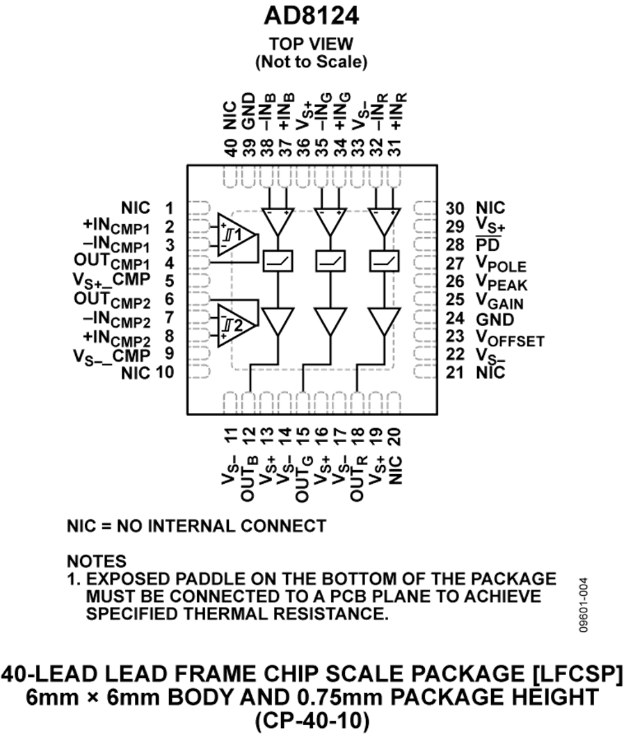 AD8124采用6 mm × 6 mm、40引腳LFCSP封裝,額定工作溫度范圍為?40°C至+85°C。