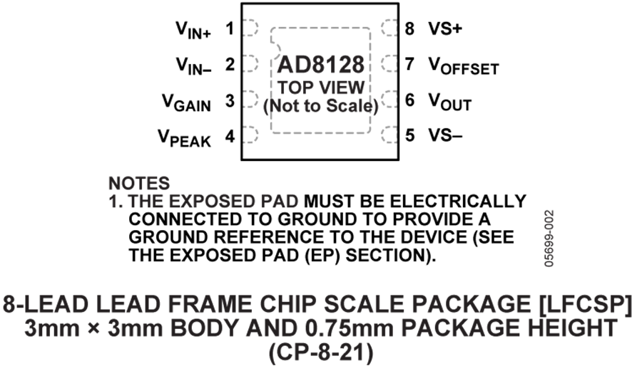 AD8128采用3 mm × 3 mm、8引腳LFCSP封裝,額定工作溫度范圍為-40°C至+85°C。