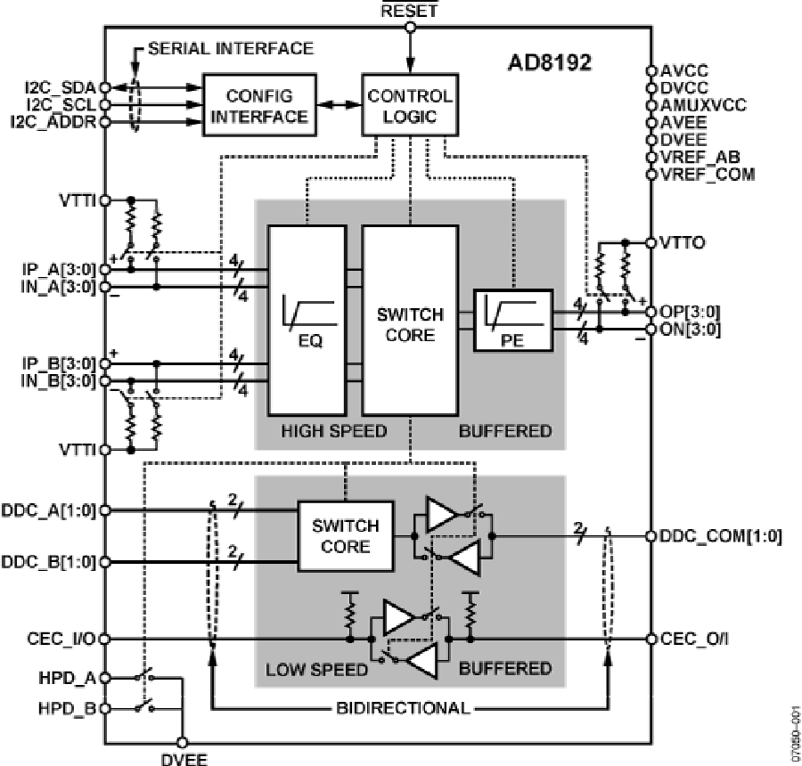具有4個TMDS通道,每個通道:支持250 Mbps~2.25 Gbps的數(shù)據(jù)速率支持25 MHz~225 MHz的像素時鐘完全緩沖的單向輸入/輸出可全局切換的50 Ω片上終端