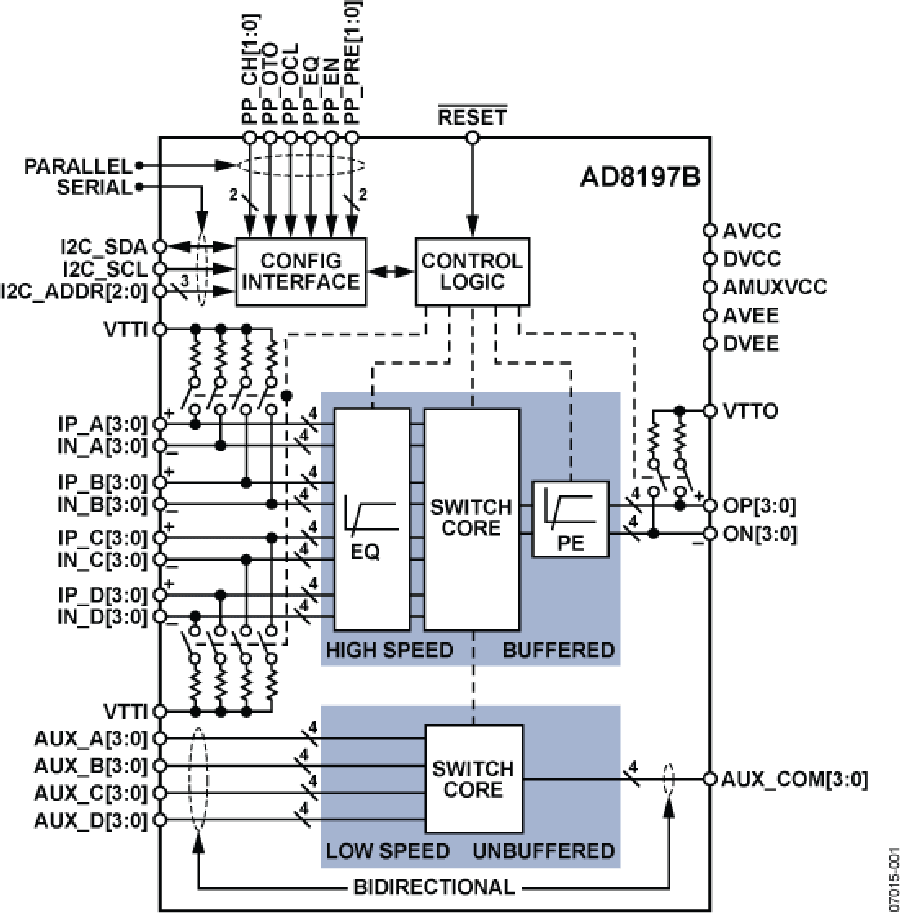 AD8197B是一款HDMI?/DVI開(kāi)關(guān),具有均衡TMDS?輸入和預(yù)加重TMDS輸出,非常適合配置較長(zhǎng)電纜的系統(tǒng)。通過(guò)I2C 控制端口,還可以獨(dú)立控制TMDS輸入端接電阻的開(kāi)關(guān)狀態(tài)。輸出可以設(shè)置為高阻抗?fàn)顟B(tài),以降低功耗,并且/或者利用線“或”技術(shù)構(gòu)建較大的陣列。AD8197B提供100引腳、無(wú)鉛、表貼LQFP封裝,額定工作溫度范圍為?40°C至+85°C。
