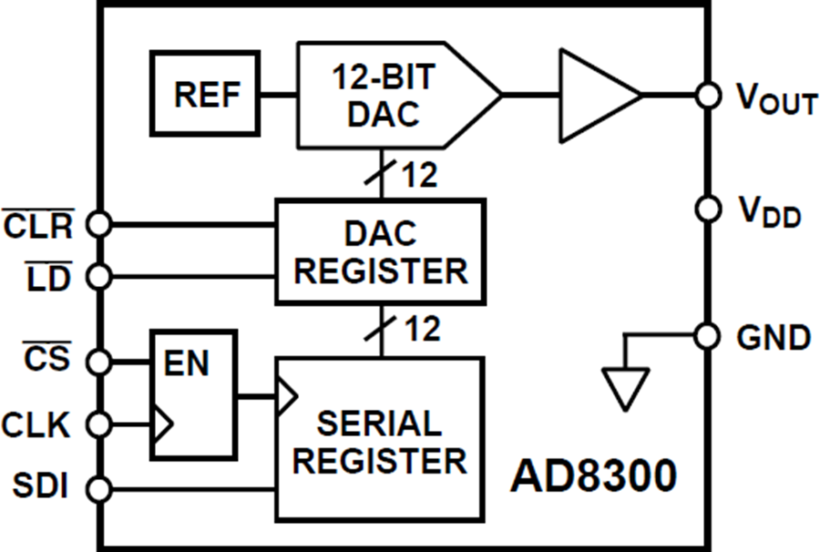 AD8300是一款完整的12位電壓輸出數(shù)模轉(zhuǎn)換器,采用+3 V單電源供電。這款單芯片DAC采用CBCMOS工藝制造,適合+3 V單電源系統(tǒng)應(yīng)用,具有成本低、易于使用的特點。保證工作電壓范圍為+2.7 V至+5.5 V,因而這款器件非常適合電池供電應(yīng)用。