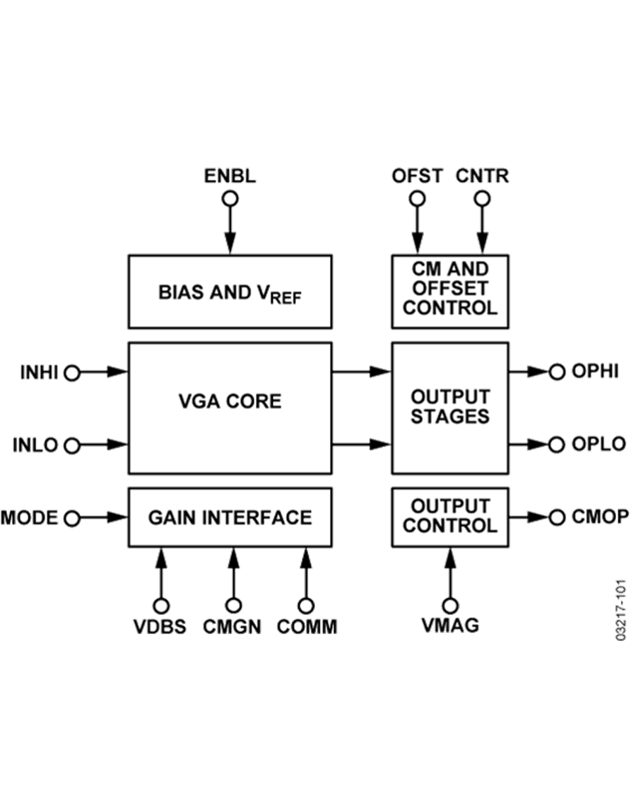 AD8330是一款DC至150 MHz寬帶寬可變增益放大器,適合要求完全差分信號通路、低噪聲、精確定義增益和適度低失真的應(yīng)用。輸入引腳也可以采用單端源驅(qū)動。峰值差分輸入為±2 V,允許1 V 均方根(rms)正弦波以寬裕的動態(tài)余量工作。輸出引腳基本上以軌到軌方式驅(qū)動單端負(fù)載。差分輸出電阻為150 ?。輸出擺幅是作用于VMAG引腳電壓的線性函數(shù),該電壓的內(nèi)部默認(rèn)設(shè)置為0.5 V,提供±2 V峰值輸出。峰值輸出可以提高至10 V p-p,主要受電源電壓的限制。