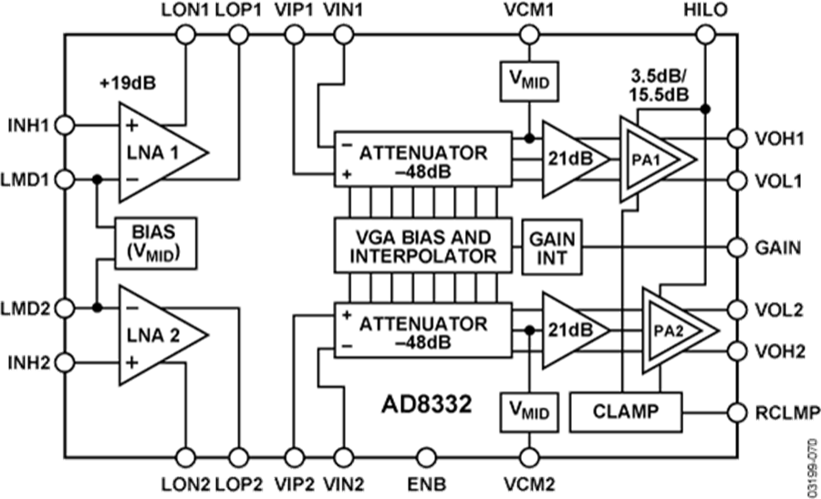 AD8332是一款雙通道、超低噪聲、線性dB可變增益放大器(VGA),針對超聲系統(tǒng)應(yīng)用進(jìn)行了優(yōu)化,可以用作低噪聲可變增益元件,頻率最高為120 MHz。各通道內(nèi)置一個超低噪聲前置放大器(LNA)、一個48 dB增益范圍的X-AMP? VGA以及一個具有可調(diào)輸出限制功能的可選增益后置放大器。LNA增益為19 dB,具有單端輸入和差分輸出。LNA輸入阻抗可以利用一個電阻來調(diào)節(jié),以便與信號源相匹配,且不影響噪聲性能。