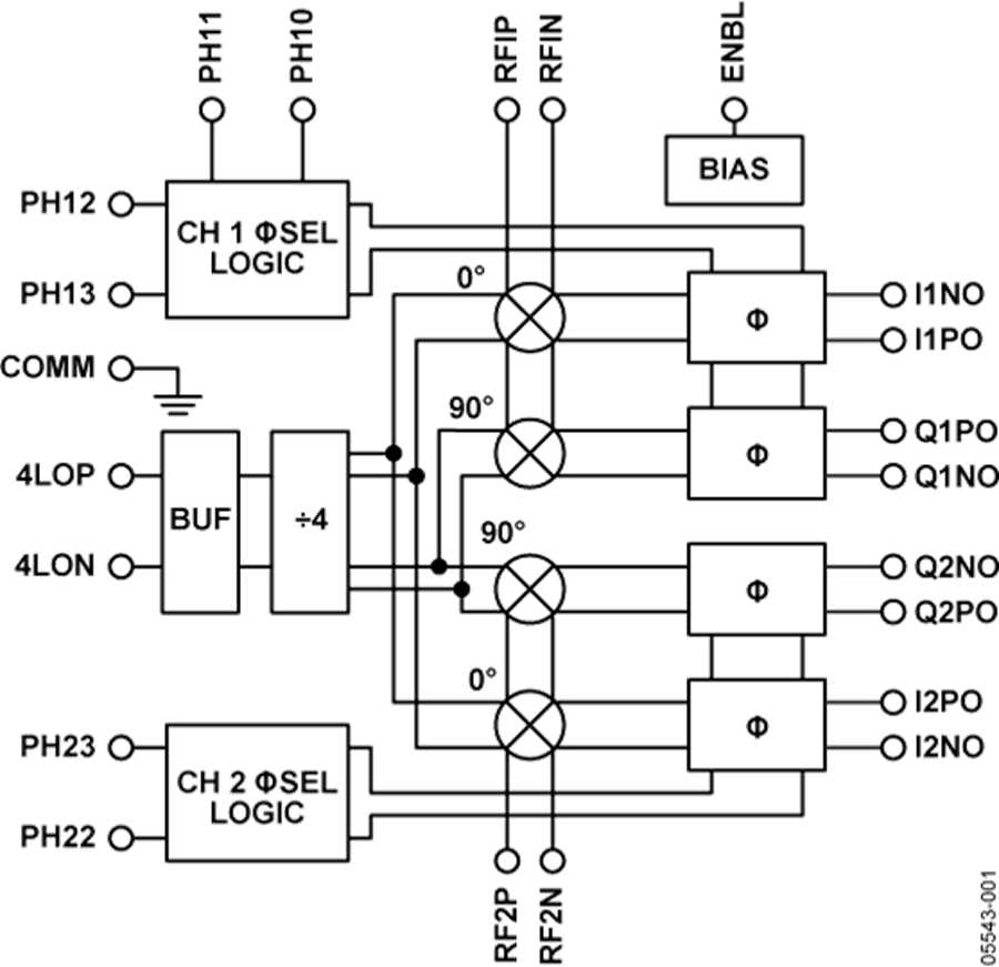 一個(gè)四分頻電路可產(chǎn)生本振(LO)的內(nèi)部0°和90°相位,驅(qū)動(dòng)一對(duì)匹配I/Q解調(diào)器的混頻器。