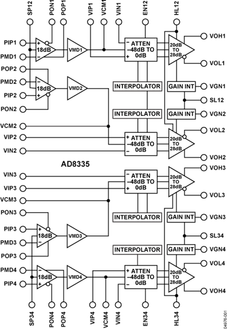 AD8335是一款四通道可變增益放大器(VGA),內(nèi)置低噪聲前置放大器,適合對成本和功耗敏感的應(yīng)用。每個通道均提供48 dB增益范圍、完全差分信號通道、有源輸入前置放大器匹配以及用戶可選的最大增益46 dB和38 dB,并且每個通道均具有單獨(dú)的增益控制。