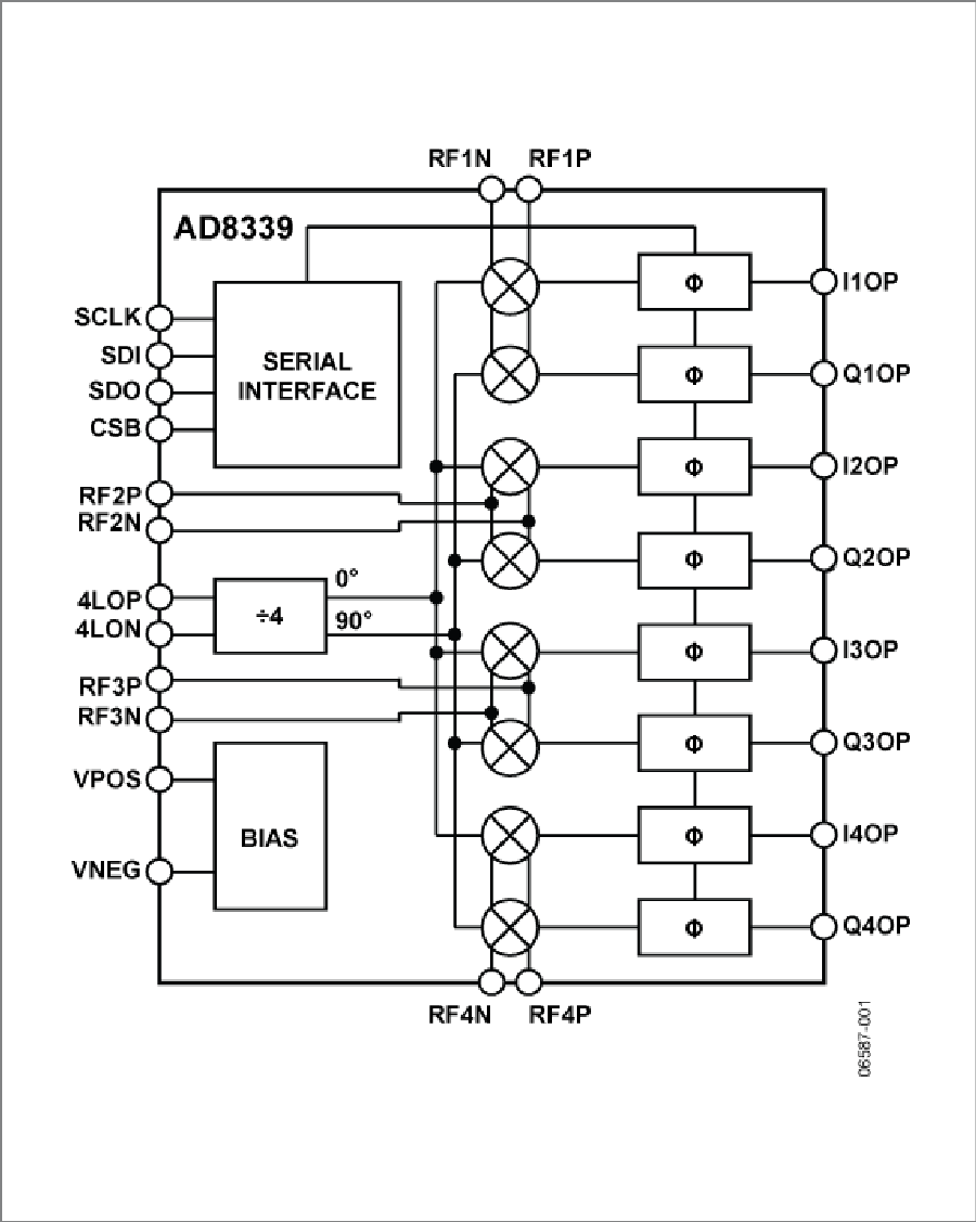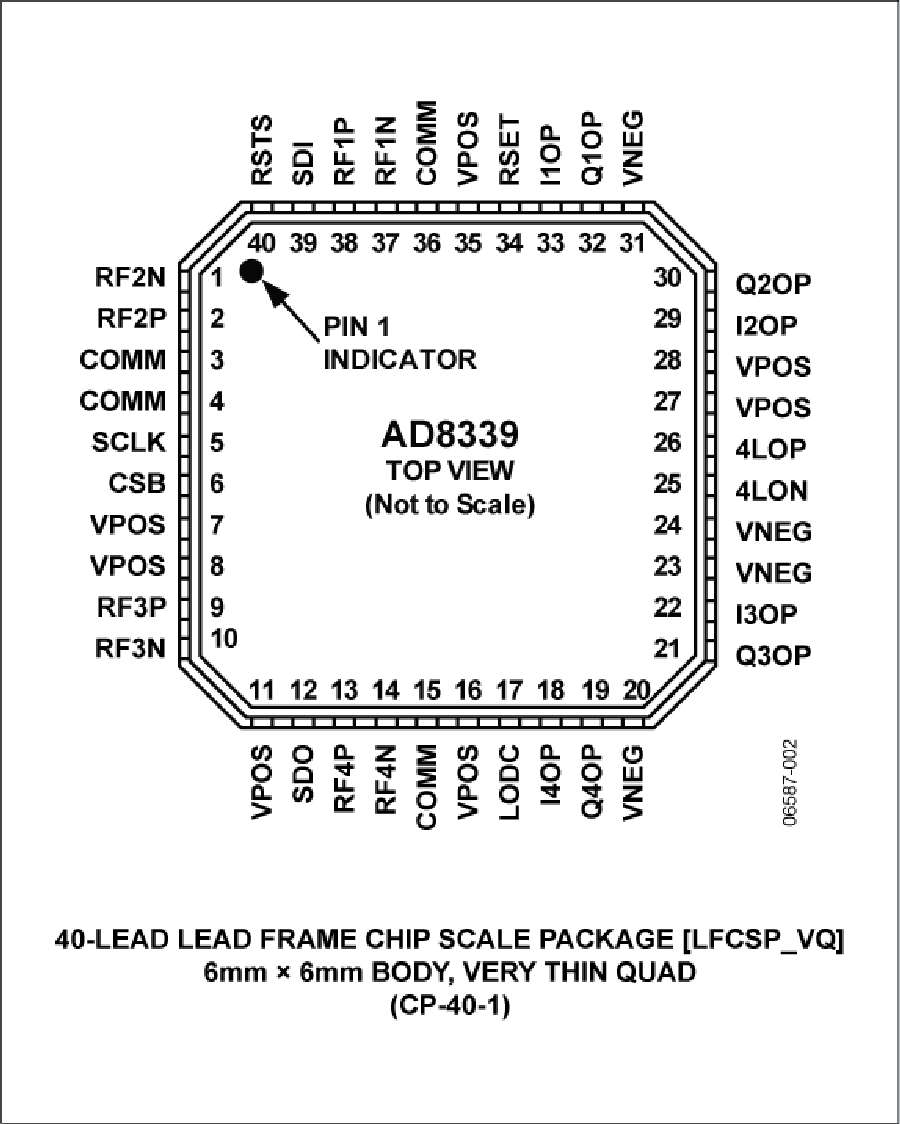 I和Q輸出的動態(tài)范圍典型值為160 dB/Hz。AD8339采用6 mm x 6 mm、40引腳LFCSP封裝,額定溫度范圍為?40°C至+85°C工業(yè)溫度范圍。