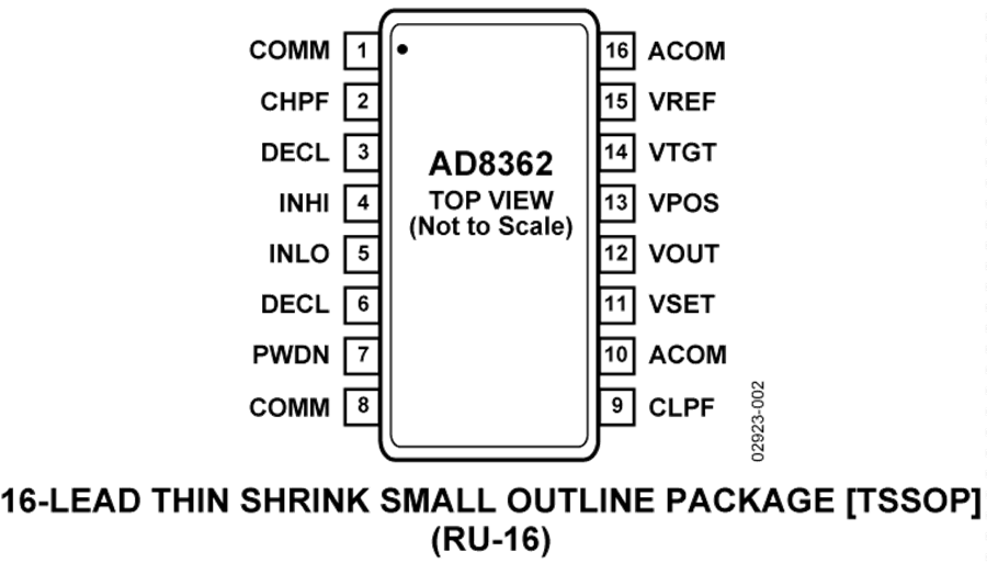 在PWDN引腳上施加邏輯高電平時,AD8362進入省電模式,功耗為1.3 mW。在25°C時,它可以在大約20 μs內(nèi)上電至標稱工作電流20 mA。AD8362采用16引腳TSSOP封裝,工作溫度范圍為?40°C至+85°C。