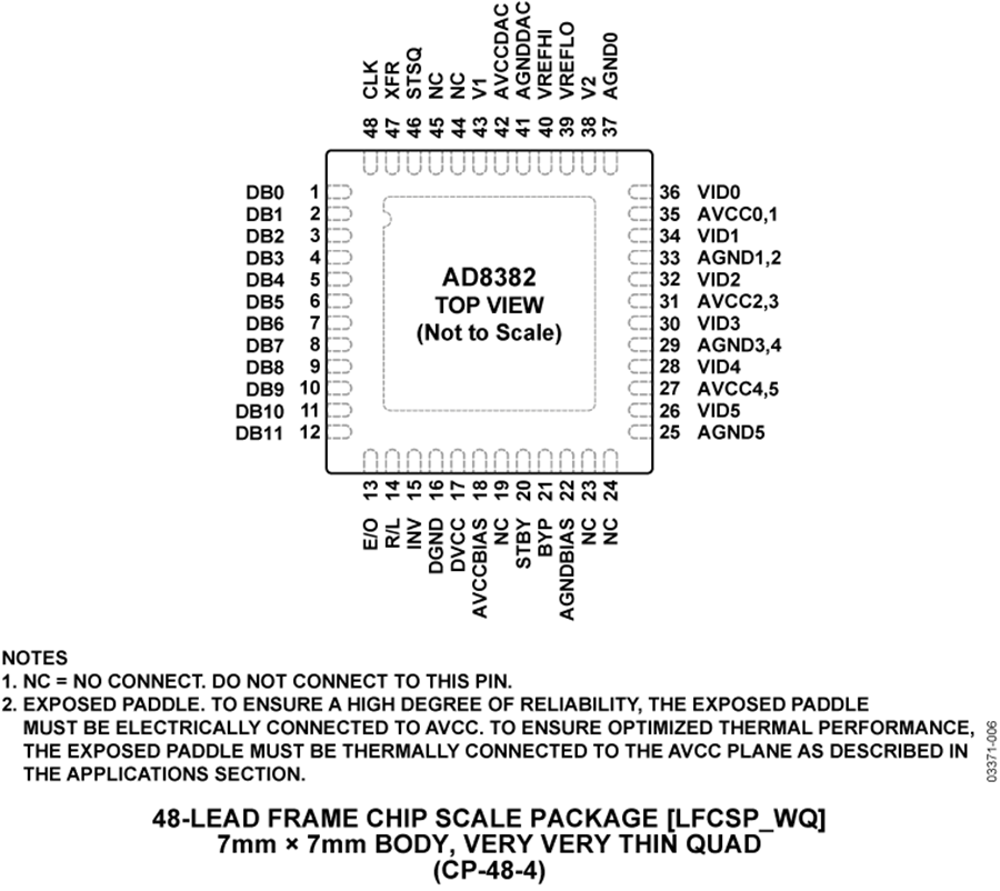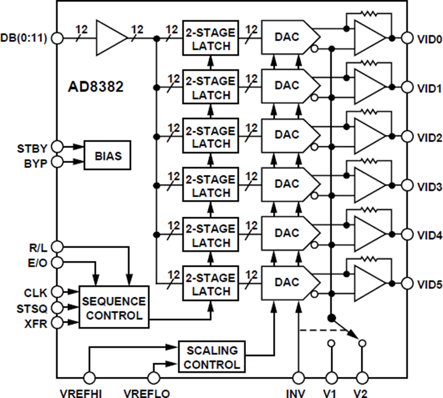 AD8382 DecDriver提供快速12位鎖存抽取數(shù)字輸入,可驅(qū)動(dòng)6個(gè)高壓輸出。 12位輸入字按順序載入到6個(gè)獨(dú)立的高速雙極性DAC。 靈活的數(shù)字輸入格式允許多個(gè)AD8382并聯(lián)用于高分辨率顯示器。